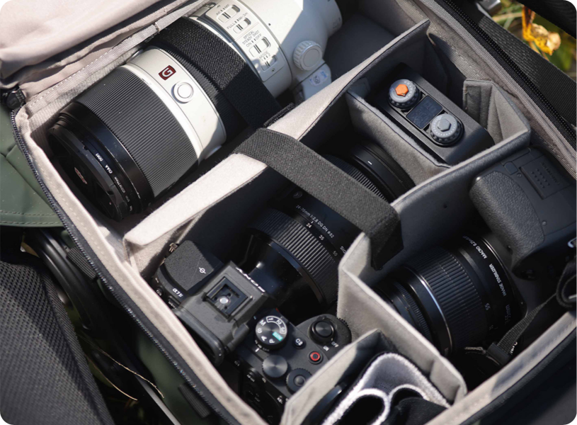 The customizable Velcro divider system lets you configure compartments to protect cameras, lenses, drones, and accessories. External MOLLE webbing enables expansion with utility pouches, tripods, or hydration packs, making it a versatile and reliable setup for outdoor creators.