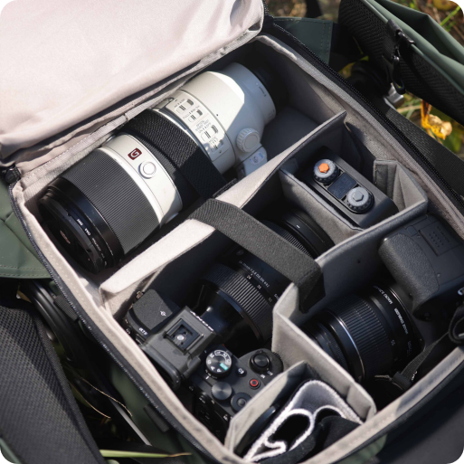 "The bag is incredibly well made and fits quite a bit of stuff. I've tried fitting as much as I can into it for each scenario I might use it. On top, I've got my air3 drone for aerial videography of events (I'm part 107 certified) Bottom front, my lumix s5iix with a mid sized macro lens. It has reduced my camera equipment footprint down from four cases to this bag."