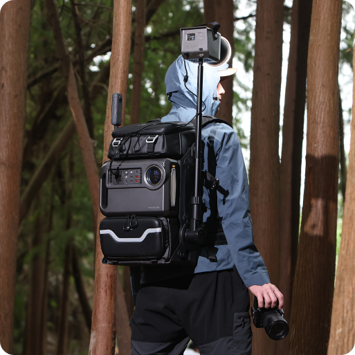 The backpack offers IPX5 water resistance, a 300Wh high-capacity power system, and a stable carry design ideal for all-day outdoor shooting.