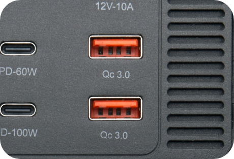 Bidirectional fast-charging port, powers laptops, tablets, and phones, or recharges the station.